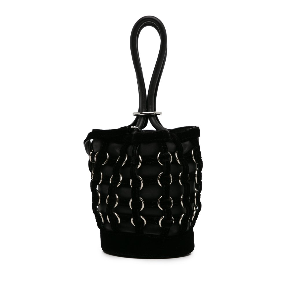 The Roxy bucket bag features a leather body with velvet trim, rolled leather handles, and an open top.