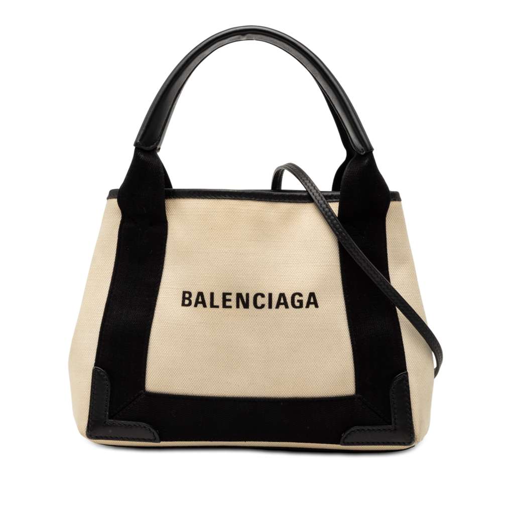 The Navy Cabas XS features a canvas body with leather trim, flat leather handles, a detachable strap, an open top with magnetic snap closure, and a zip pouch inclusion.