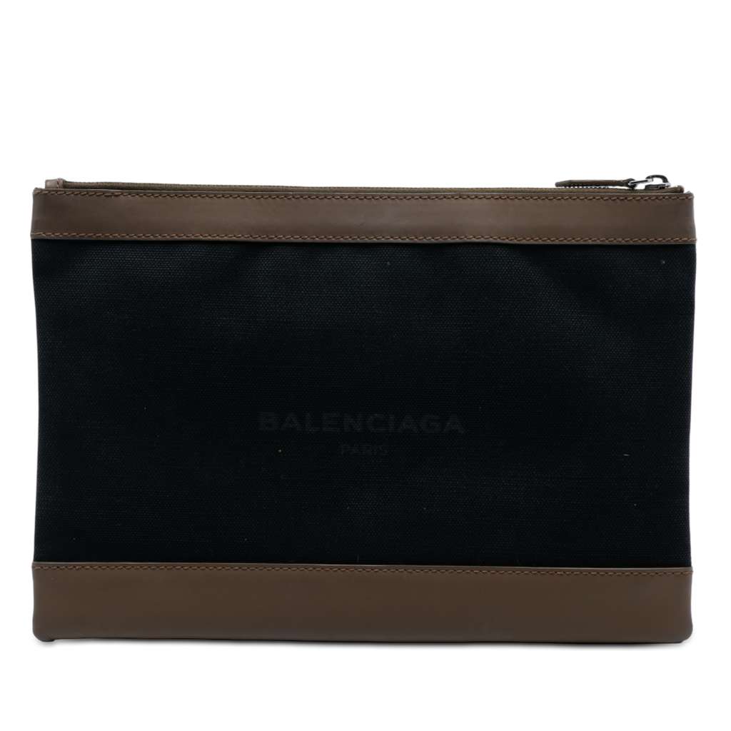 The Navy Clip M features a canvas body with leather trim, a top zip closure, and an interior slip pocket.