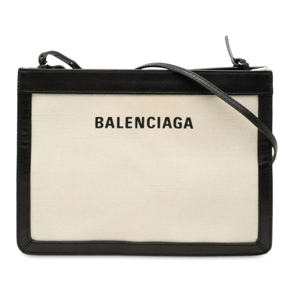 The Navy Pochette crossbody bag features a canvas body with leather trim, an adjustable flat leather shoulder strap, a top zip closure, and an interior slip pocket.