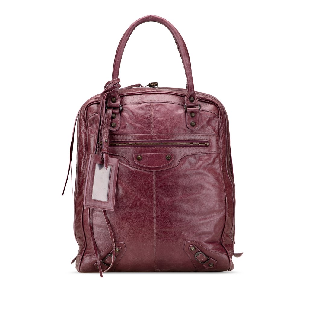 This handbag features a goatskin leather body with stud details, rolled leather handles, a top zip closure, a front exterior zip pocket, and an interior slip pocket.