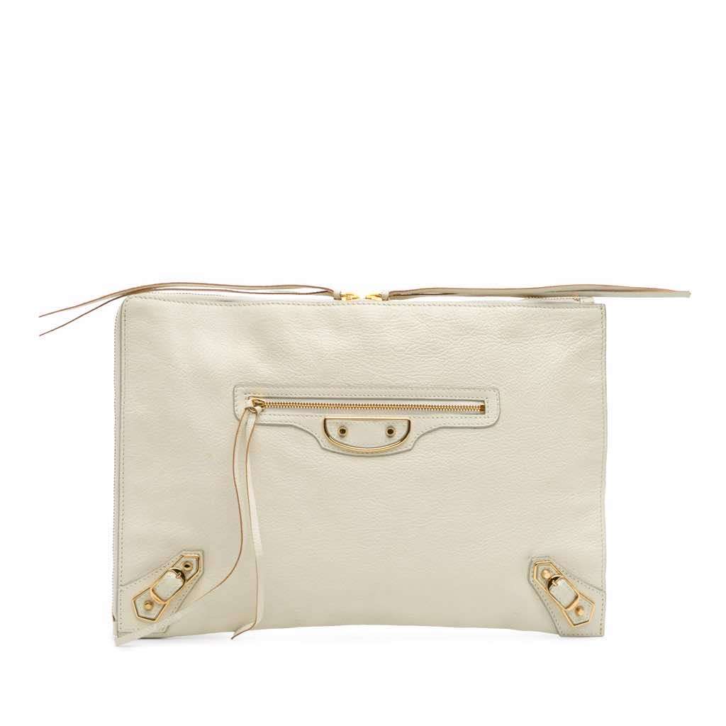 This clutch bag features a goatskin leather body, a zip around closure, an exterior front zip pocket, and an interior slip pocket.