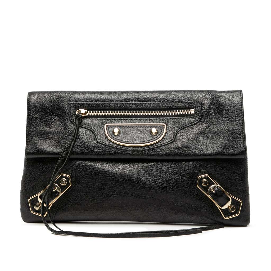The Envelope clutch features a goatskin leather body, a flap with a magnetic closure, an exterior front zip pocket, and an interior zip pocket.