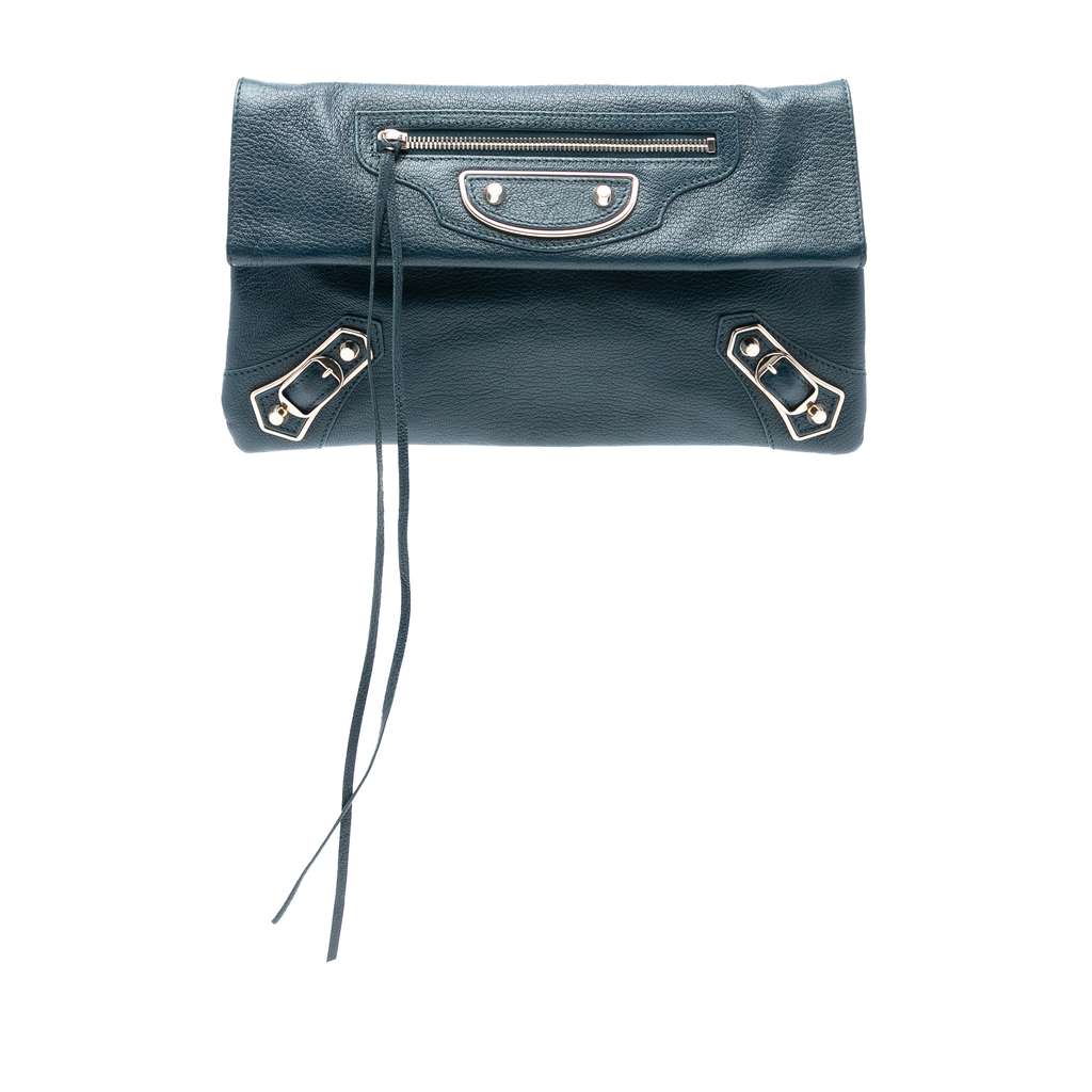 The Envelope clutch features a goatskin leather body, a top flap with a magnetic closure, an exterior front zip pocket, and an interior zip pocket.