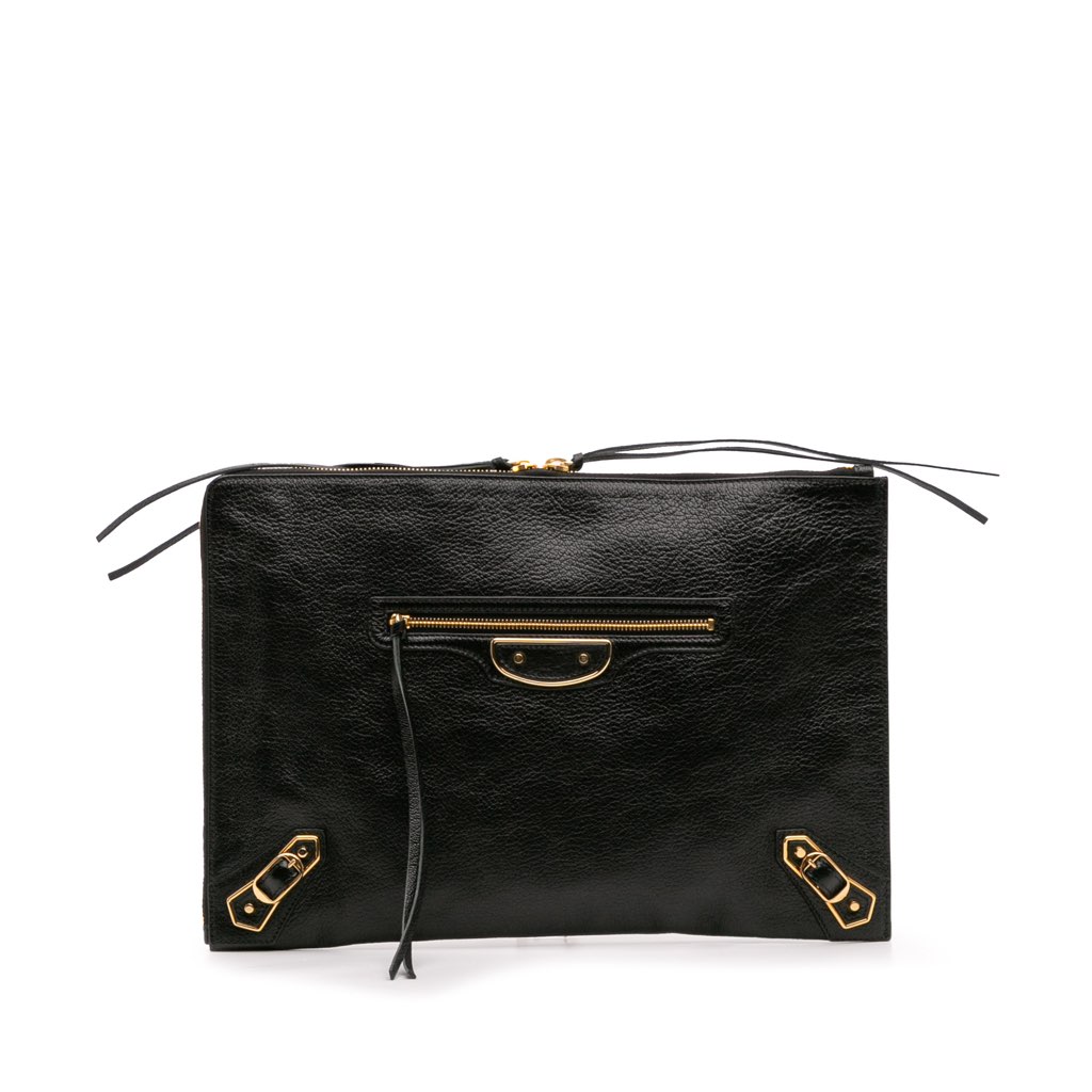 This clutch bag features a goatskin leather body, a top zip closure, an exterior front zip pocket, and an interior slip pocket.