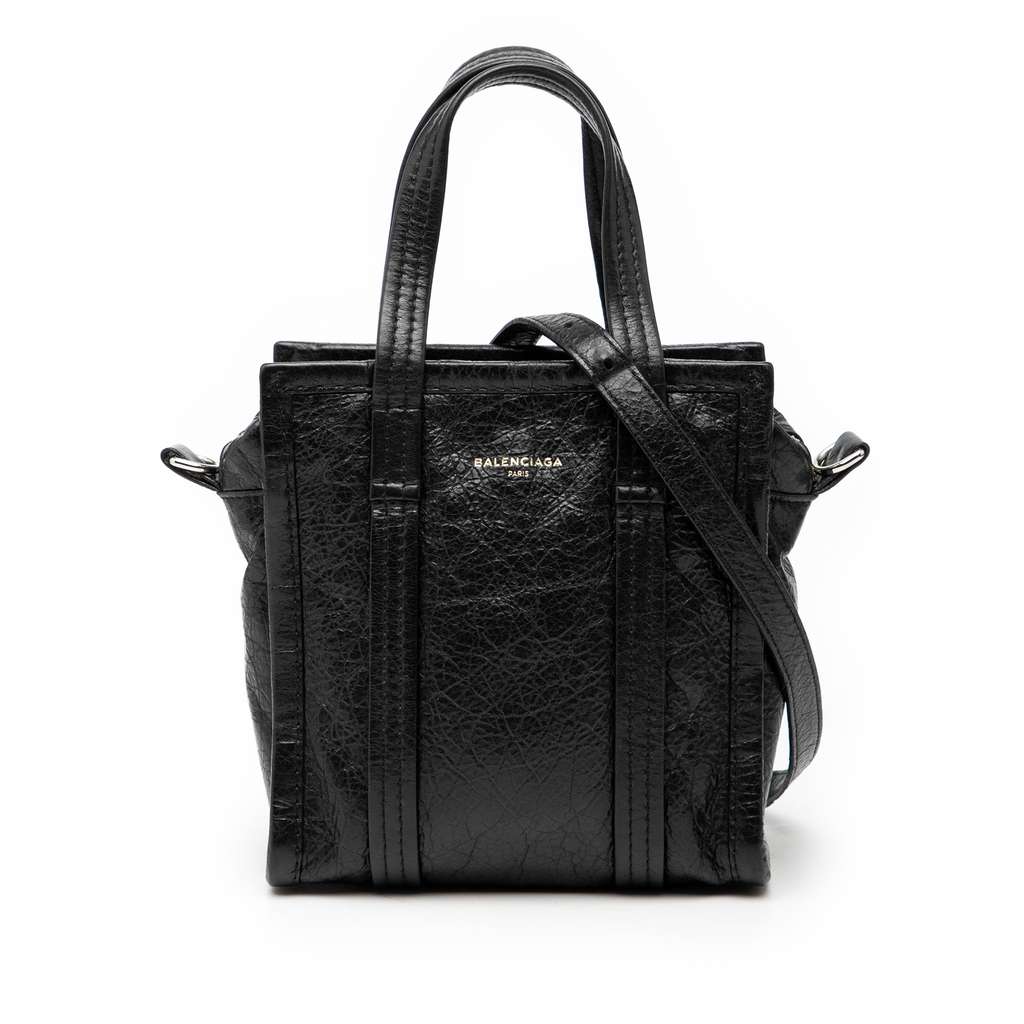 The Bazar Shopper features a lambskin leather body, flat leather handles, a detachable and adjustable flat leather strap, dual top zip closure, and an interior slip pockets.