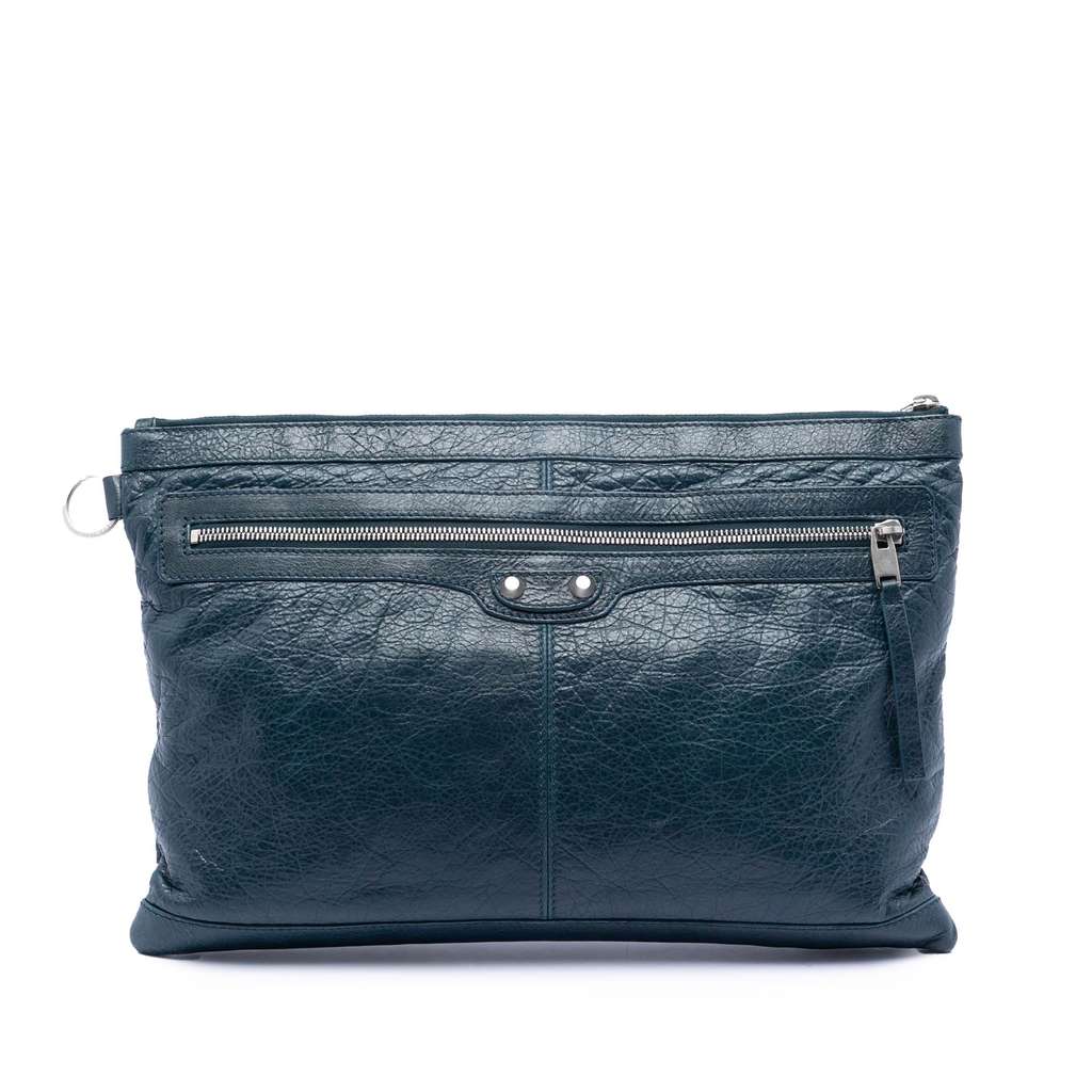This clutch bag features a lambskin leather body, a top zip closure, and an exterior front zip pocket.