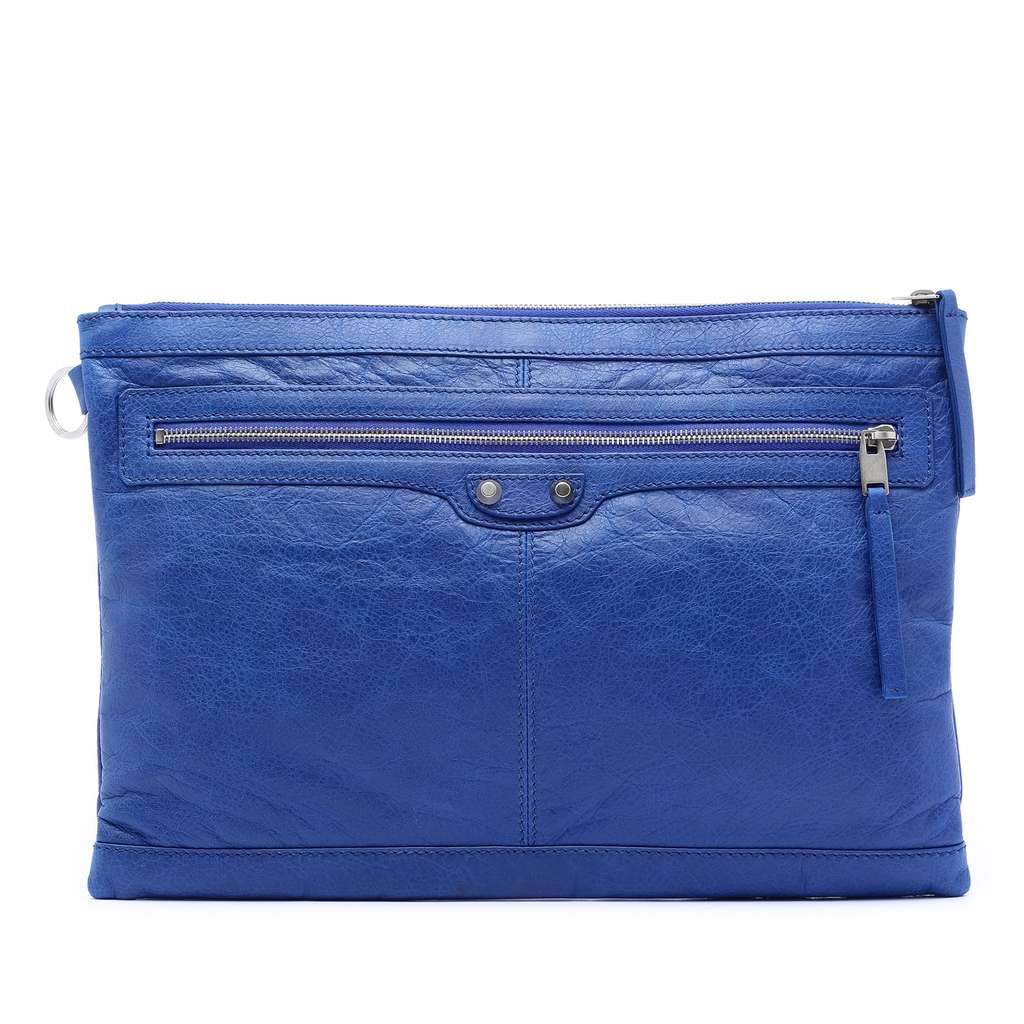 This clutch bag features a lambskin leather body, a top zip closure, an exterior front zip pocket, and an interior slip pocket.