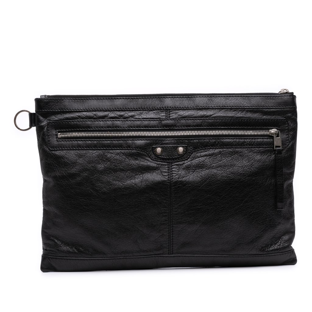 This clutch bag features a lambskin leather body, a top zip closure, and an exterior front zip pocket.