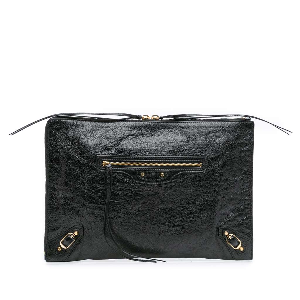 This clutch bag features a lambskin leather body, a zip around closure, an exterior front zip pocket, and an interior slip pocket.