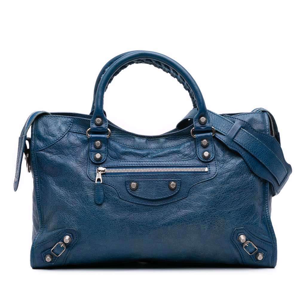 This satchel features a lambskin leather body with stud details, rolled leather handles, a detachable flat shoulder strap, a top zip closure, an exterior front zip pocket, and an interior zip pocket.