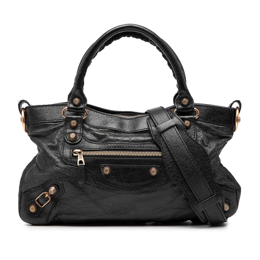 The Motocross First satchel features a lambskin leather body, rolled leather handles, a detachable flat leather strap, a top zip closure, an exterior front zip pocket, and an interior zip pocket.