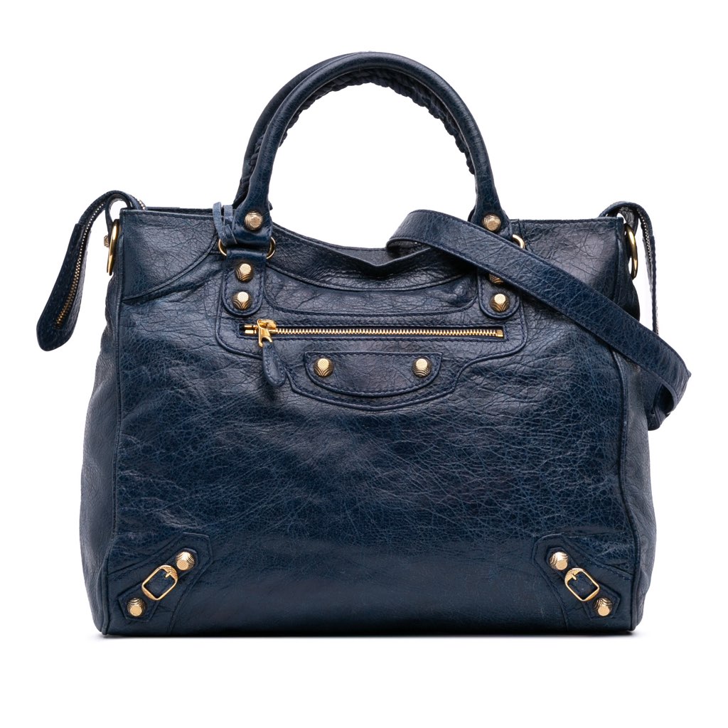 This satchel features a lambskin leather body with stud details, rolled leather handles, a detachable flat shoulder strap, a top zip closure, an exterior front zip pocket, and an interior zip pocket.