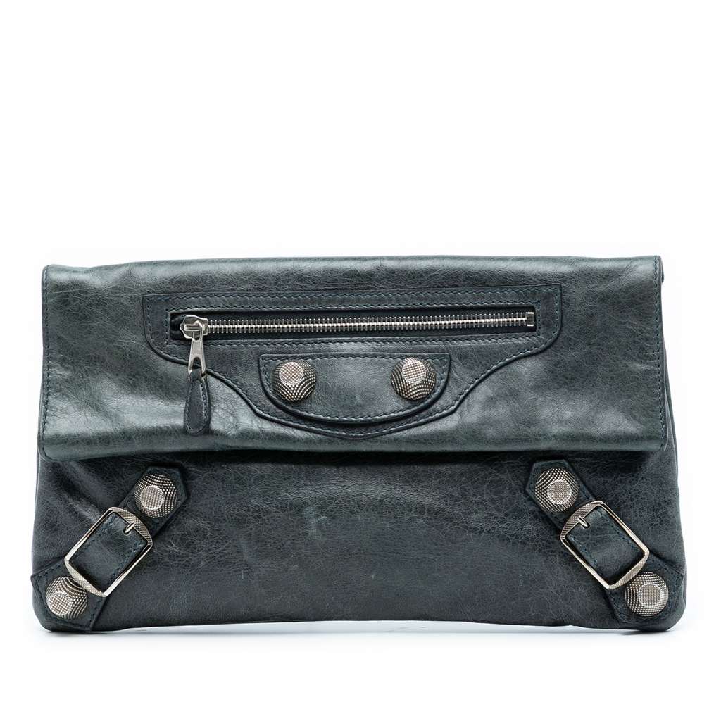 The Motocross Giant 21 Envelope clutch features a lambskin leather body, a top flap with a magnetic snap closure, and a front exterior zip pocket.