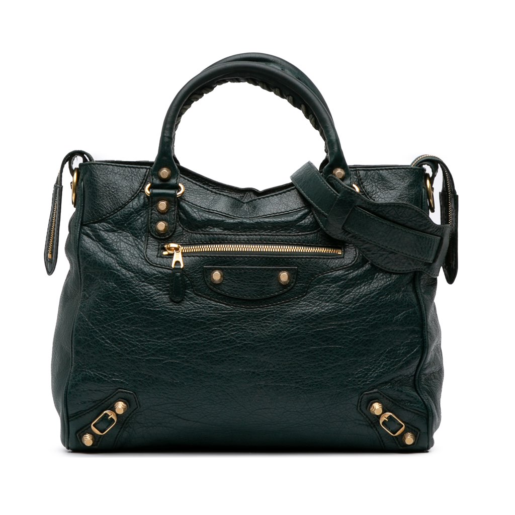 The Giant Velo satchel features a lambskin leather body, rolled leather handles, a detachable flat strap, a top zip closure, an exterior front zip pocket, and an interior zip pocket.