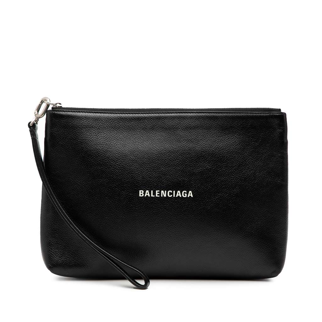 This clutch bag features a leather body, a detachable flat leather wrist strap, a top zip closure, an exterior back slip pocket , and an interior slip pocket.