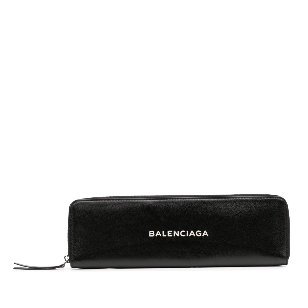This clutch features a leather body, a zip-around closure, and interior slip pockets.