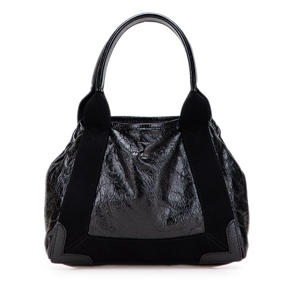 The Navy Cabas XS features a leather body, flat leather handles, an open top, and an interior zip pocket.