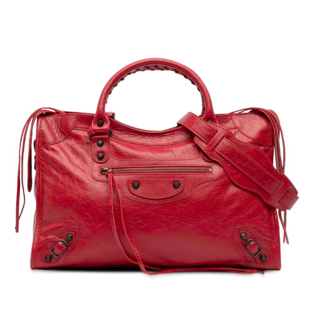 The Motocross Classic City features a lambskin leather body, rolled leather handles, detachable flat strap, a top zip closure, an exterior front zip pocket, and an interior zip pocket.