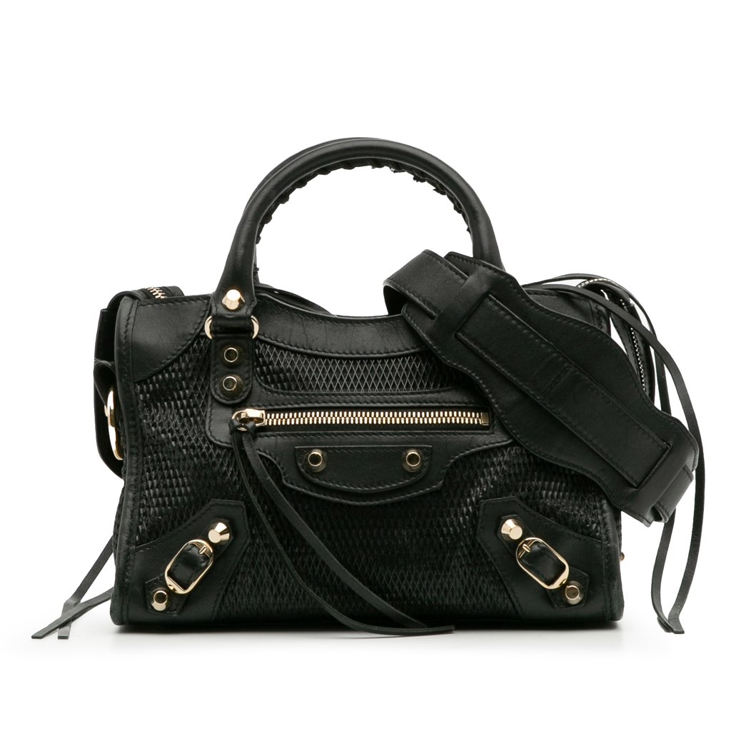 The Mini City features an embossed leather body, rolled handles, a detachable flat leather strap, a top zip closure, an exterior front zip pocket, and an interior zip pocket.