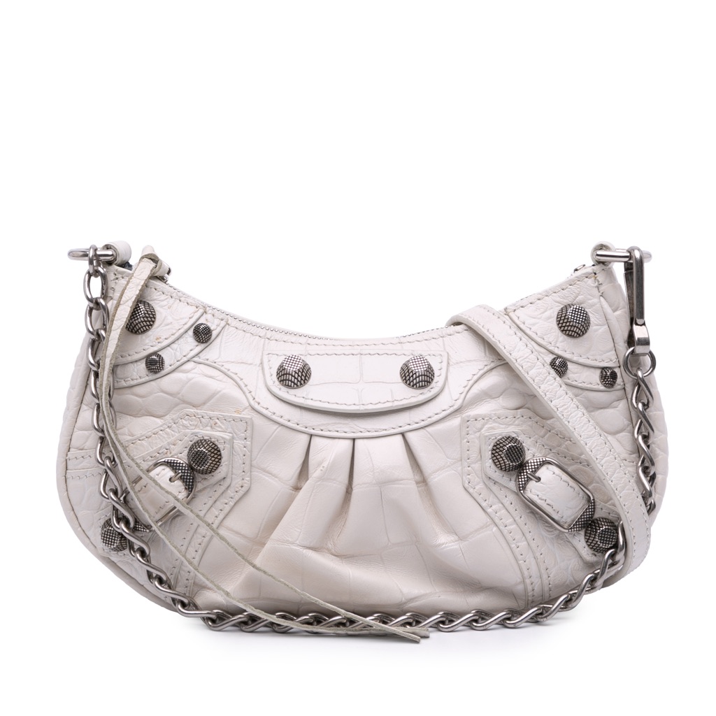 The Le Cagole features an embossed leather body, a chain link handle, an adjustable and detachable flat leather shoulder strap, a top zip closure, and interior slip pockets.