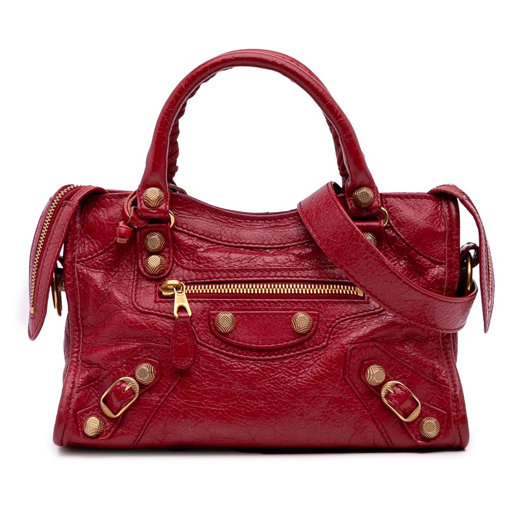 The Mini City features a distressed lambskin leather body, rolled leather handles, a detachable flat leather strap, a top zip closure, an exterior front zip pocket, and an interior zip pocket.