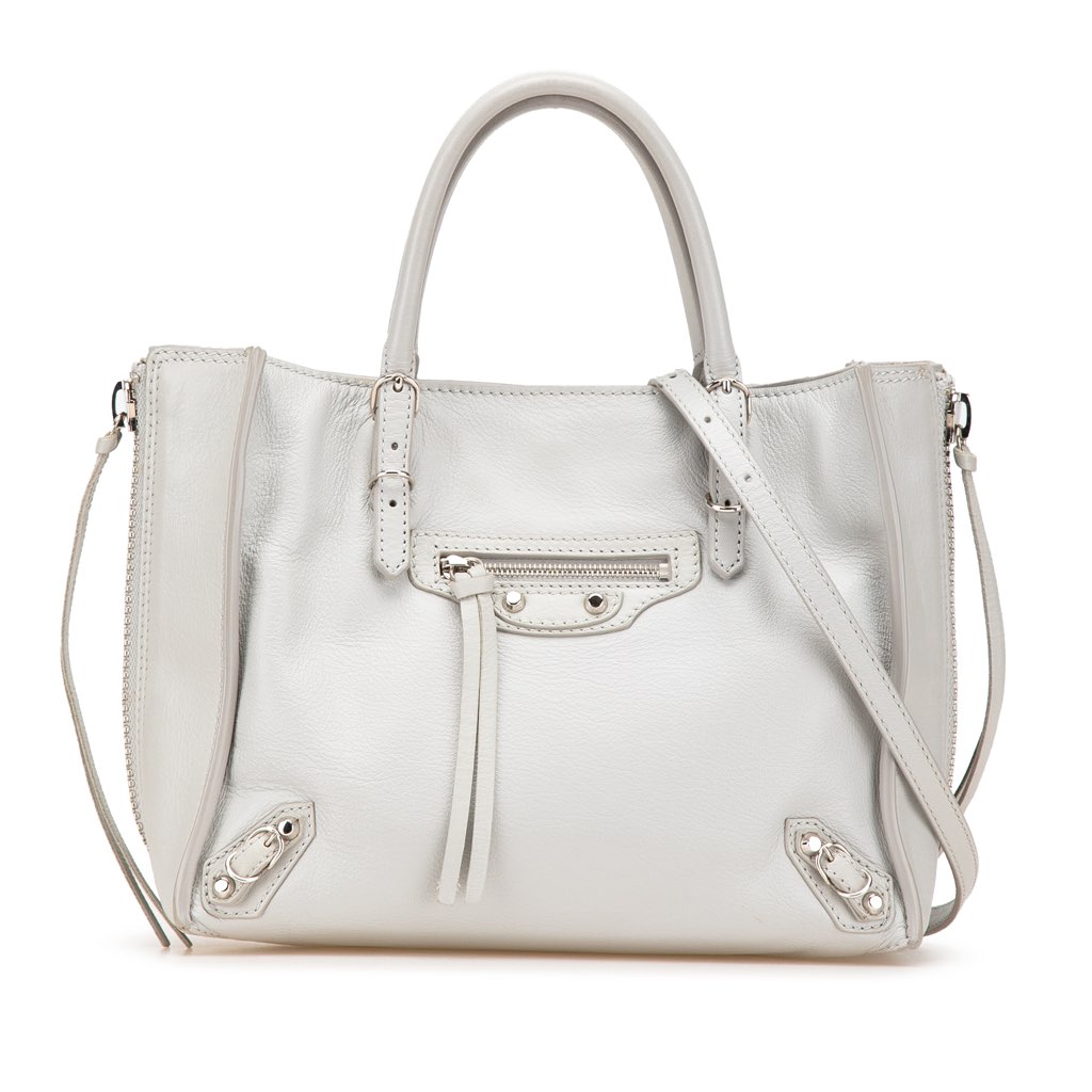 The Papier A4 features a leather body, rolled leather handles, a detachable strap, an open top, an exterior front zipper detail, and interior slip pockets.