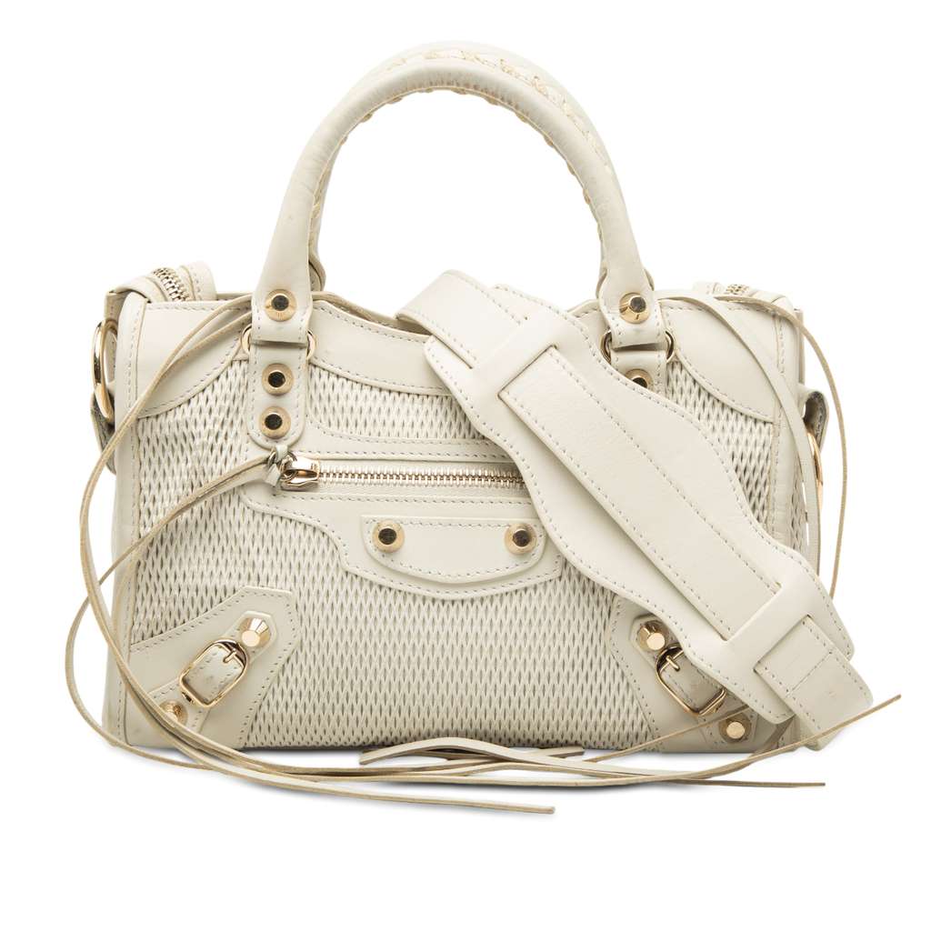 This satchel features a leather body, rolled leather handles, a detachable and adjustable flat leather strap with leather guard, a top zip closure, an exterior front zip pocket, and interior zip and slip pockets.