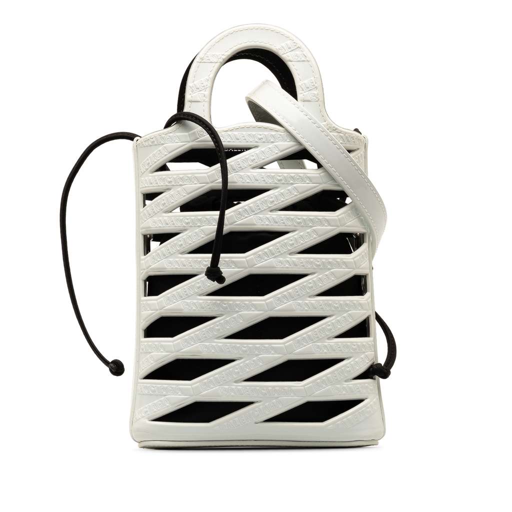 The Phone Holder features a leather body, flat leather handles, a flat leather strap, and an open top.