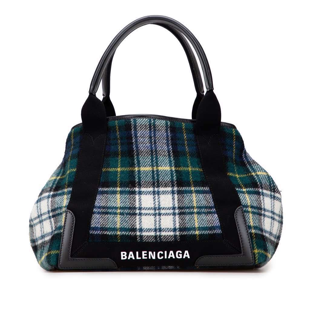 The Navy Cabas S features a plaid wool body, flat leather top handles, an open top, and a pouch inclusion.