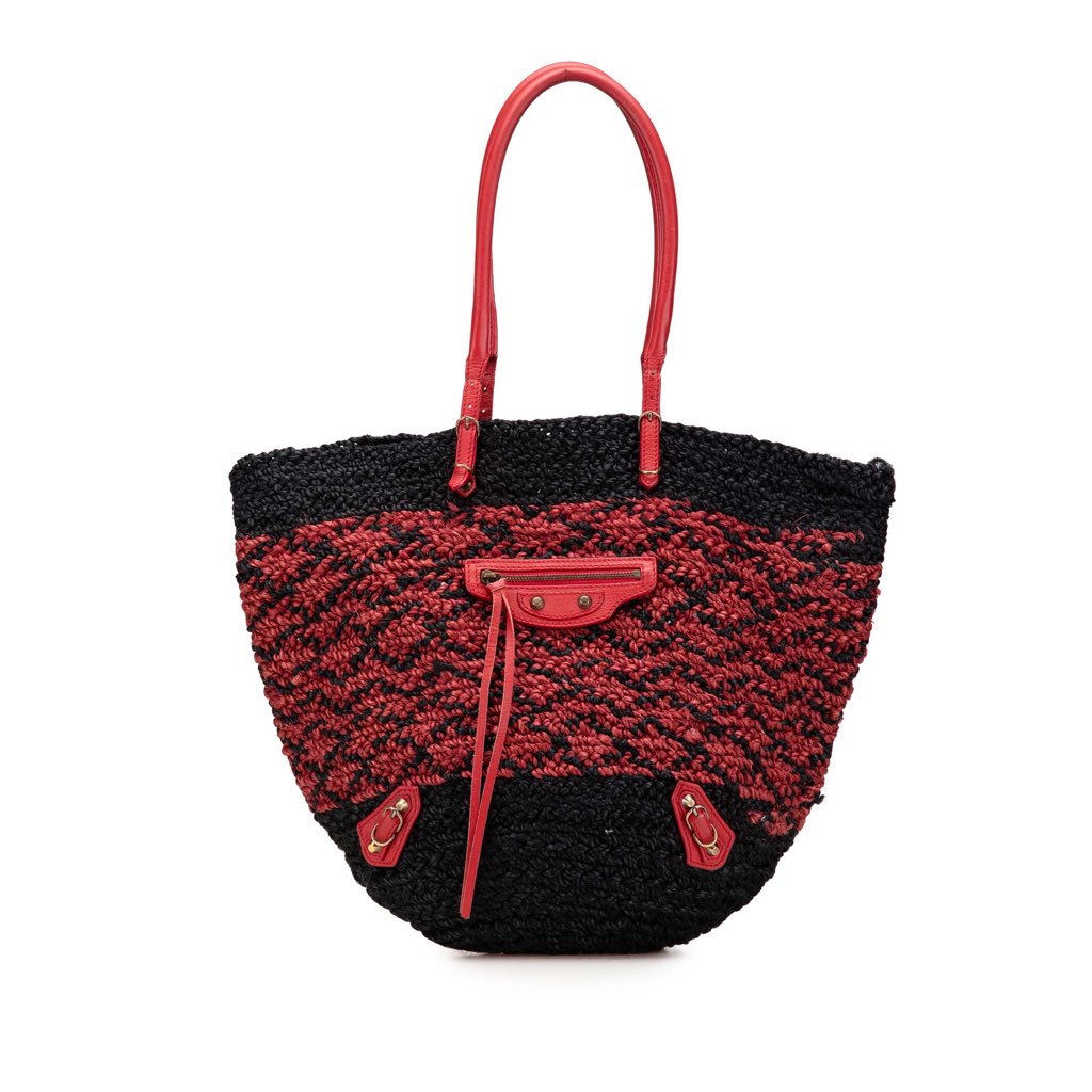 The Motocross Panier tote features a raffia body, rolled leather handles, an open top, an exterior front zip pocket, and an interior slip pocket.