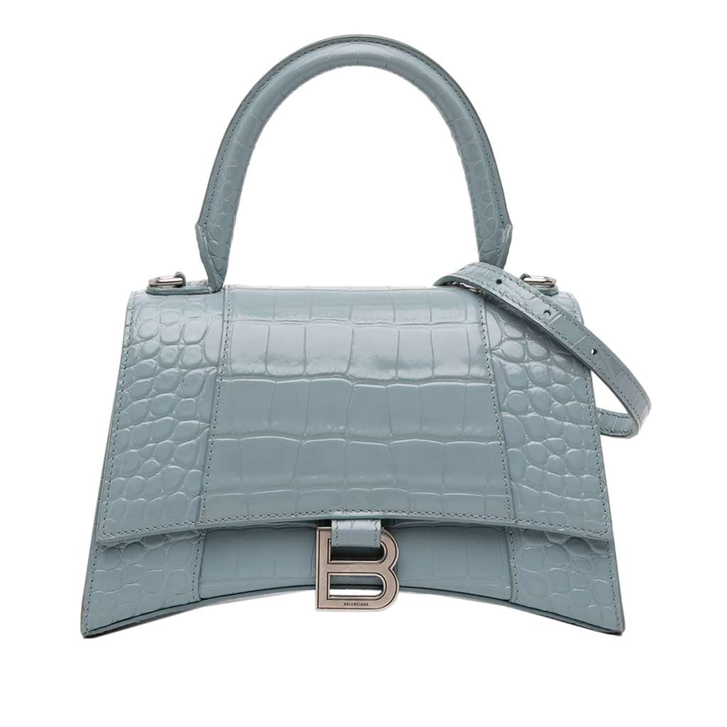 The Hourglass features an embossed leather body, a rolled top handle, a detachable flat leather shoulder strap, a front flap with magnetic snap closure, and an interior zip pocket.