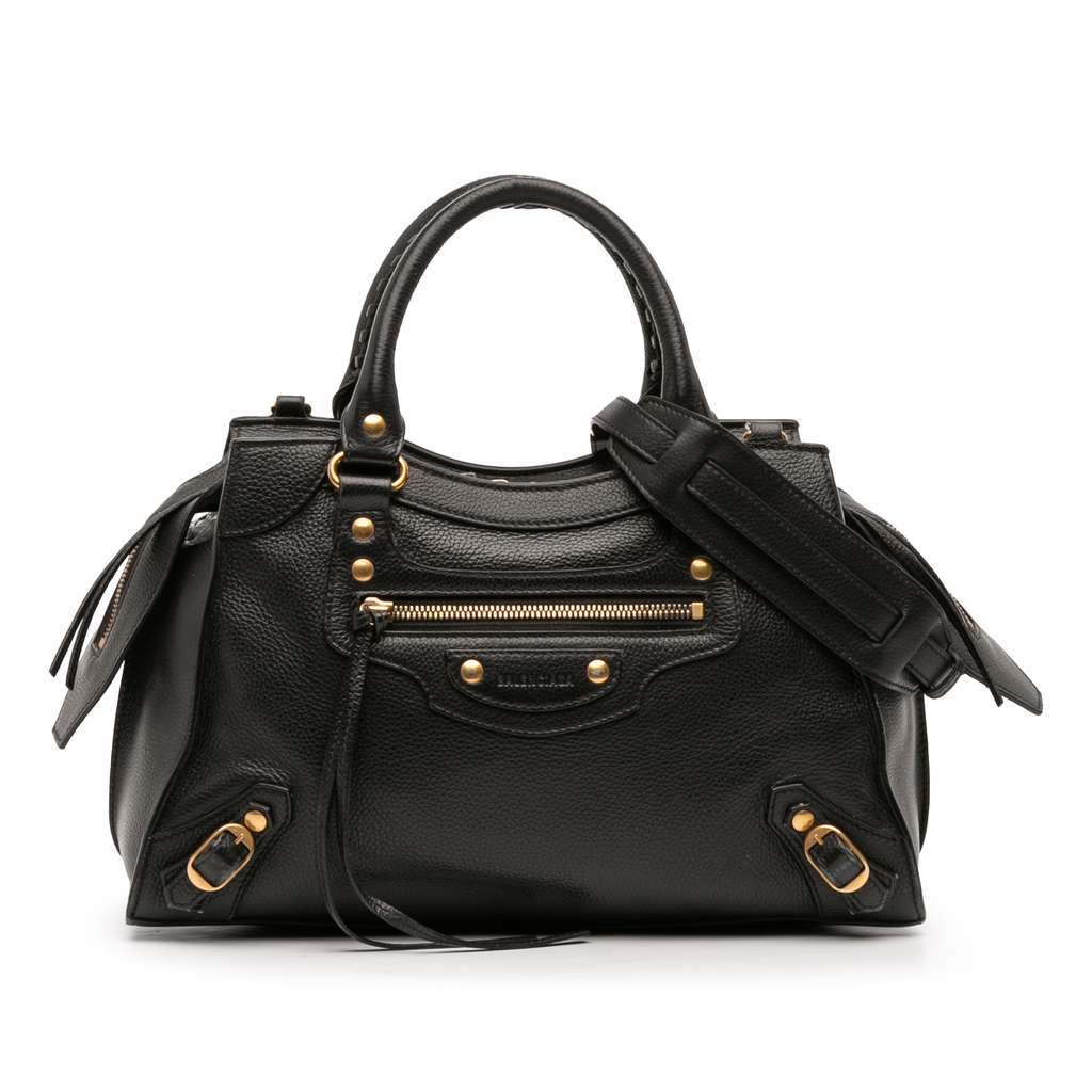 The Neo Classic City features a leather body, rolled leather handles, a detachable flat leather shoulder strap, a top zip closure, an exterior front zip pocket, and an interior slip pocket.