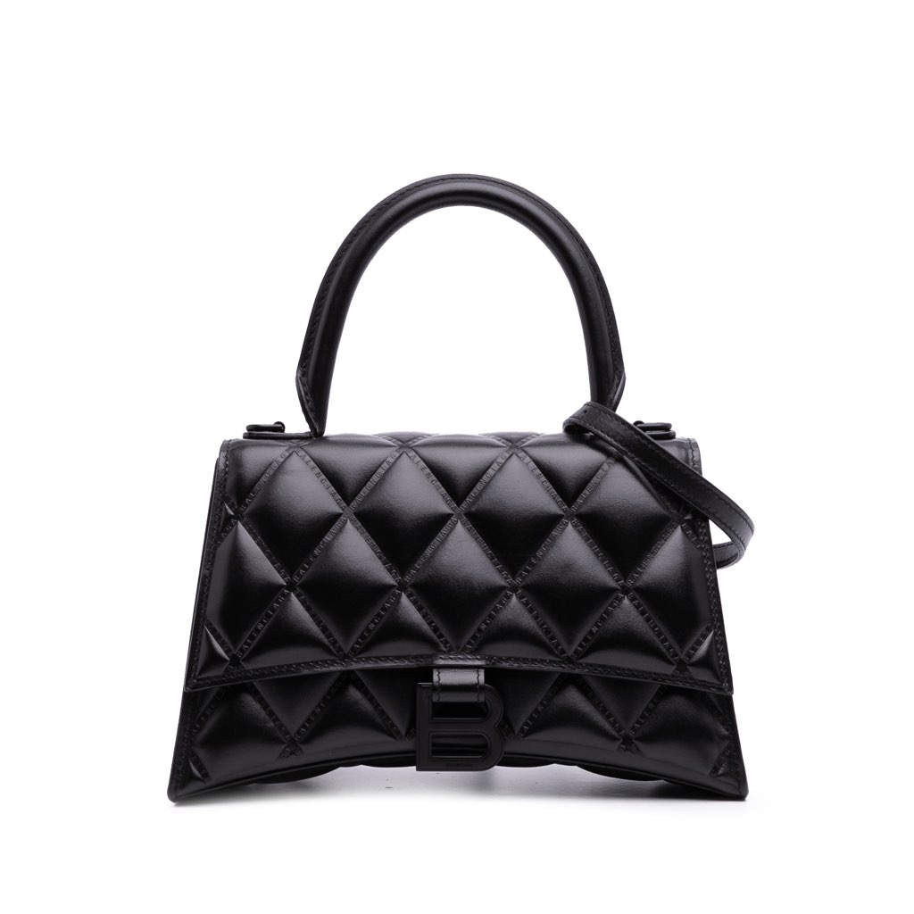 The Hourglass bag features a leather body, a rolled top handle, a detachable flat leather strap, a front flap with magnetic snap button closure, and interior zip and slip pockets.
