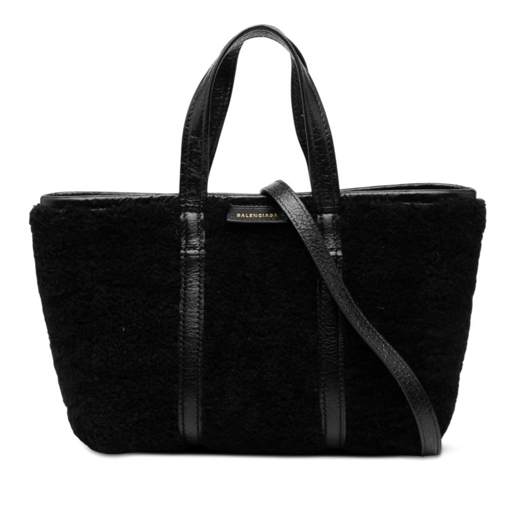 This satchel features a shearling and leather body, flat leather handles, a detachable and adjustable flat leather strap, an open top with magnetic closure, and an interior zip pocket.