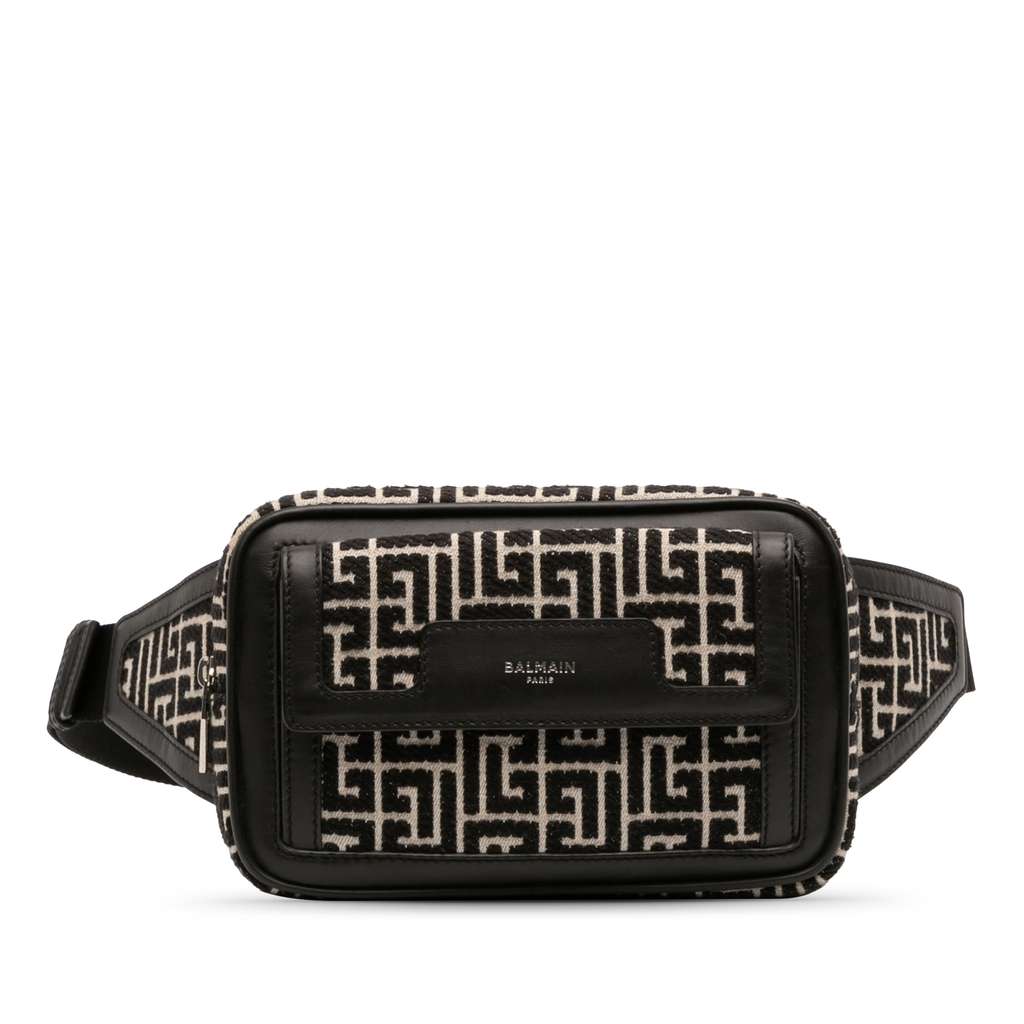 This belt bag features a jacquard body with leather trim, a flat waist strap, a zip around closure, an exterior front flap compartment, and an interior slip pocket.