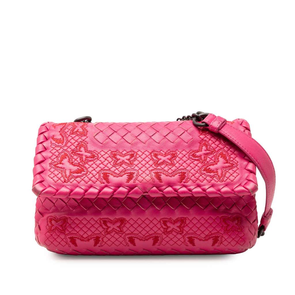 The Olimpia bag features a woven leather body with butterfly embroideries, a chain-link strap with leather guard, a top flap with magnetic snap closure, and an interior slip pocket.