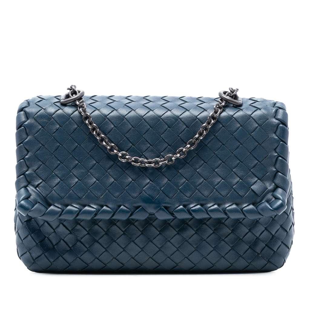 The Olimpia features a woven leather body, a chain link shoulder strap with leather guard, a flap with magnetic snap closure, and an interior slip pocket.