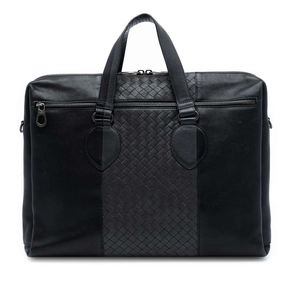 This business bag features a nappa leather body, flat leather handles, a top zip closure, an exterior front zip pocket, and interior zip and slip pockets.