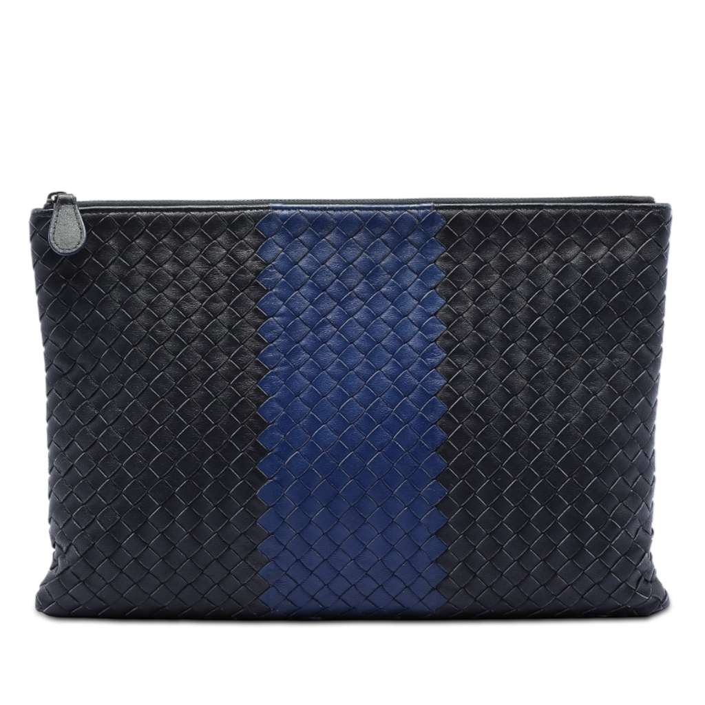 This clutch features a woven nappa leather body, and a top zip closure.