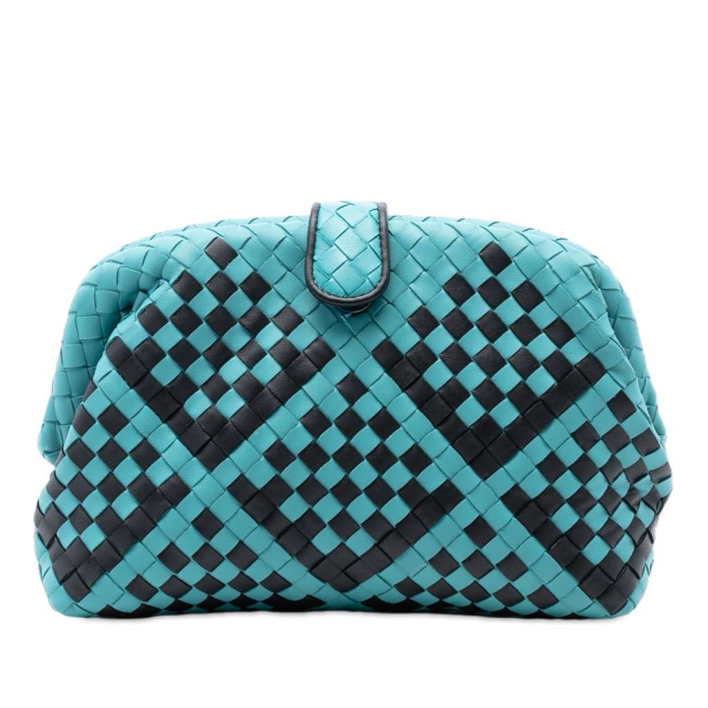 This clutch bag features a woven nappa leather body, a top strap with snap closure, and an interior zip pocket.