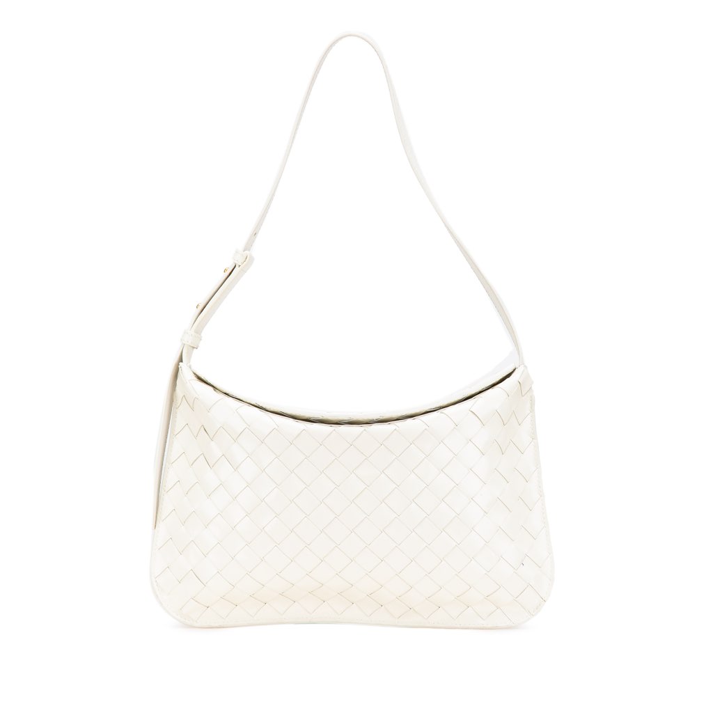 This shoulder bag features a woven leather body, an adjustable flat leather strap, and a top flap closure.