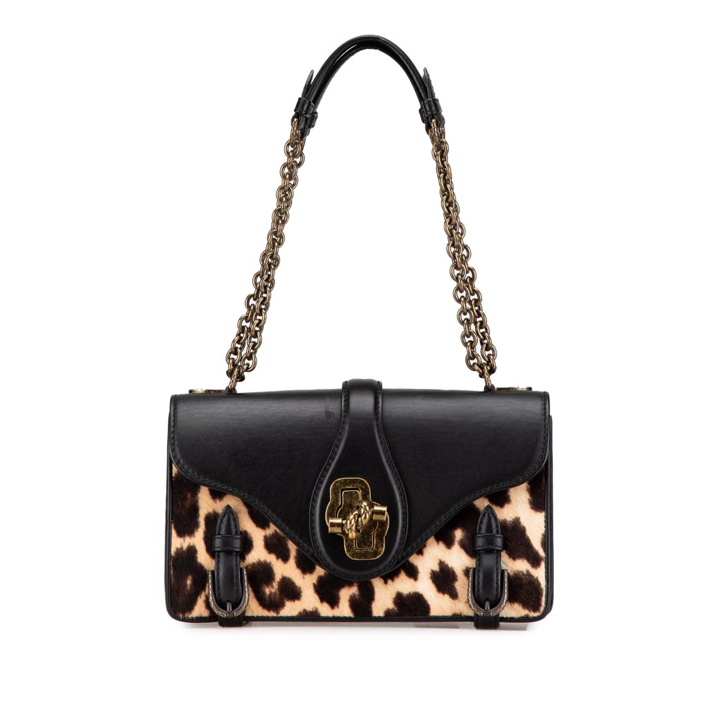 This shoulder bag features a leather and pony hair body, a chain strap with leather guard, a front flap with metal turn-lock closure, three interior compartments, and an interior slip pocket.
