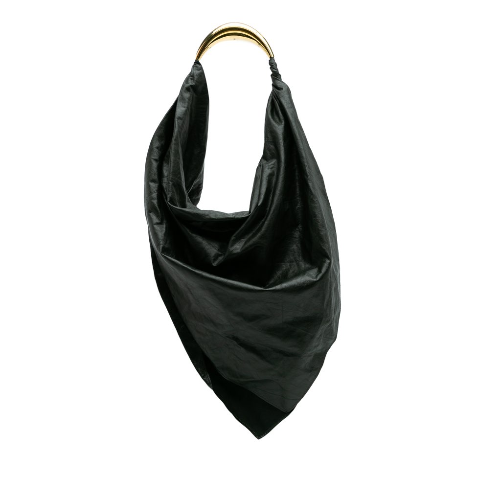 This shoulder bag features a leather body, a gold-tone metal handle, and a top zip closure.
