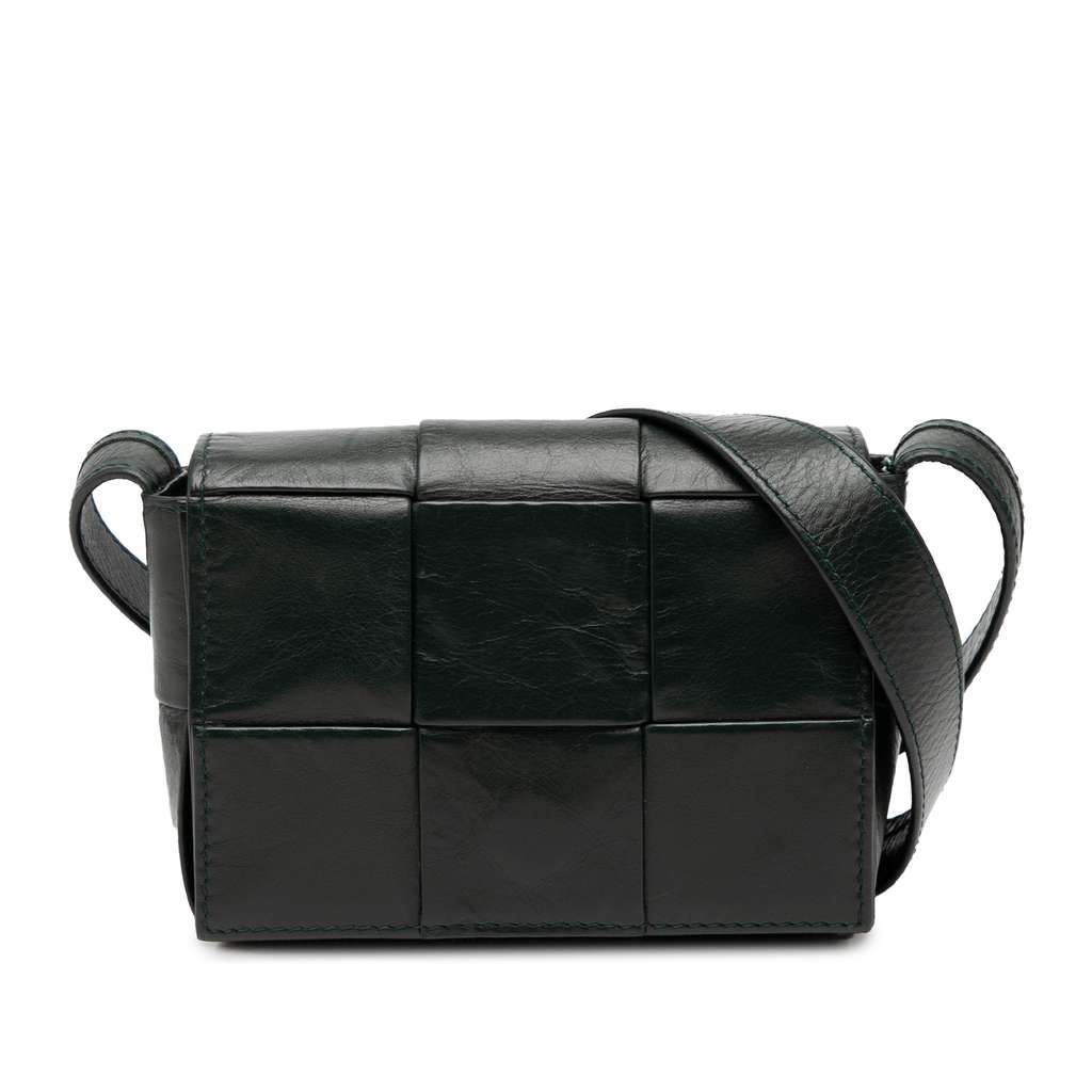 This crossbody bag features a woven nappa leather body, a flat leather strap, a front flap with magnetic snap closure, and an interior slip pocket.