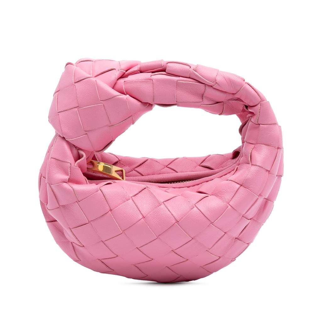 The Mini Jodie features a woven leather body, a knotted woven leather handle, and a top zip closure.