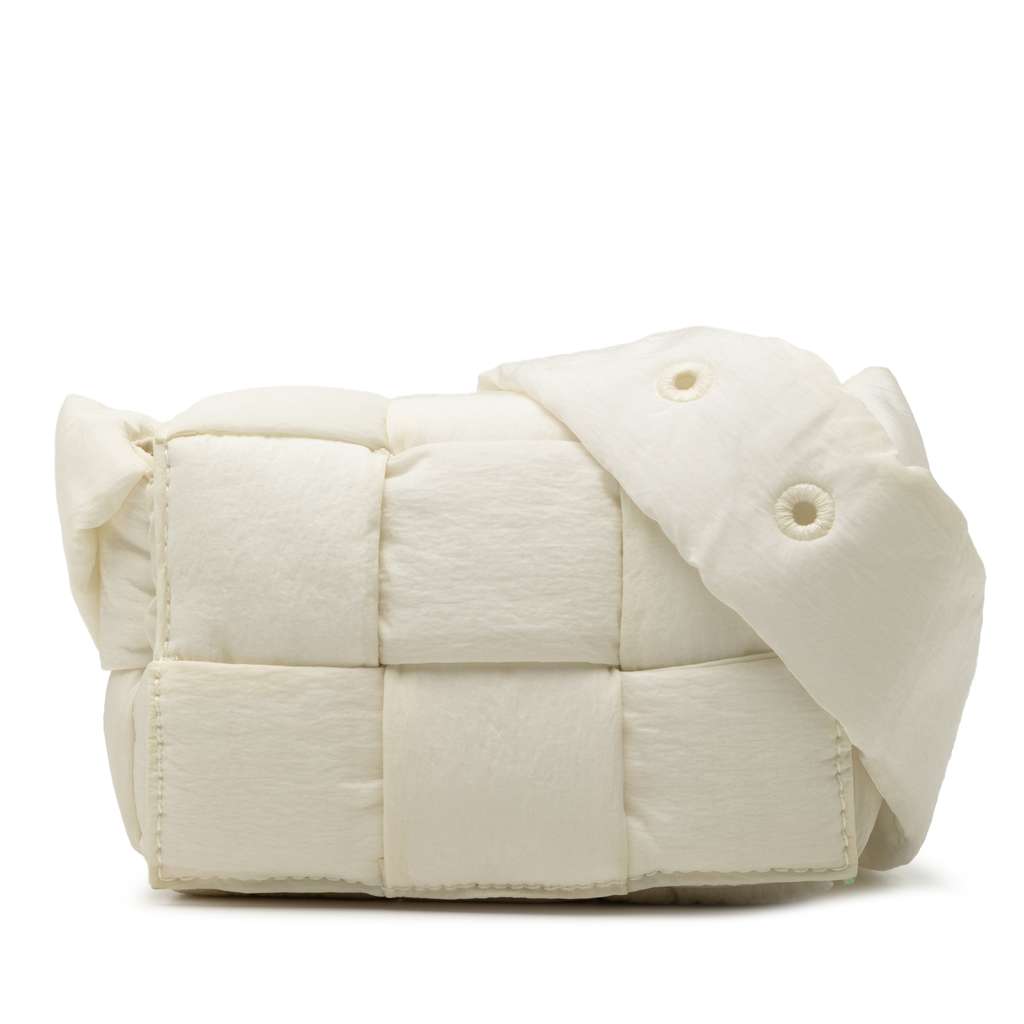 This crossbody bag features nylon body with intrecciato weave, a shoulder strap, and a front flap closure.