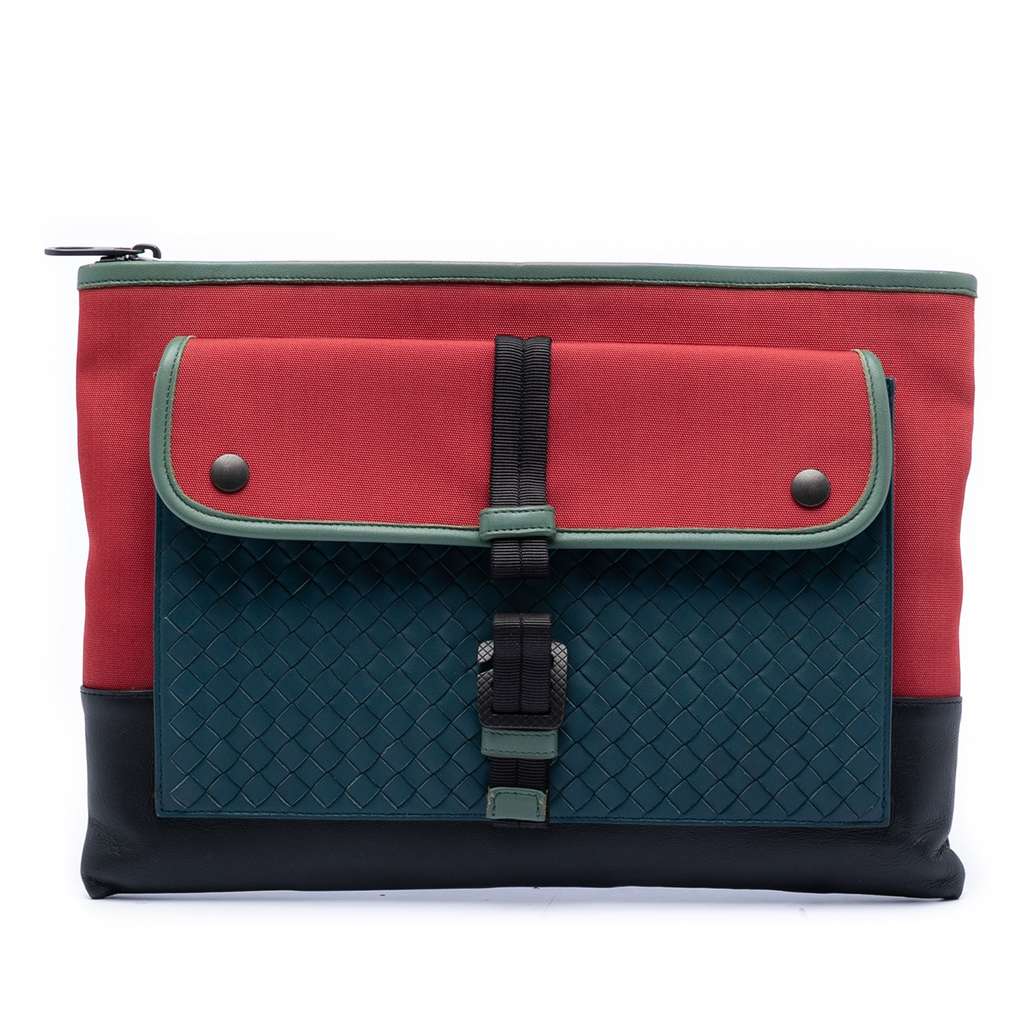 This clutch bag features a canvas body with leather trim, a top zip closure, and an exterior front flap compartment with a hook lock closure.