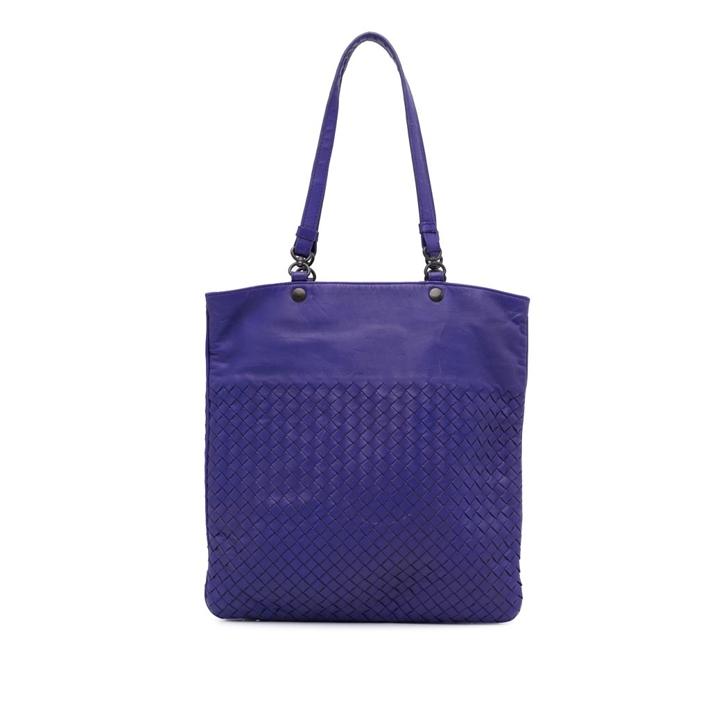 This tote bag features a woven leather body, flat leather handles, an open top with magnetic closure, and interior zip and slip pockets.
