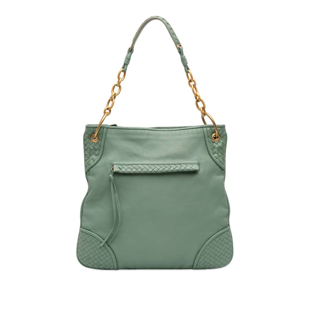 Bottega Veneta Intrecciato Trimmed Leather Shoulder Bag Gree